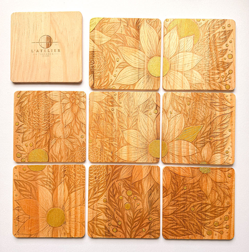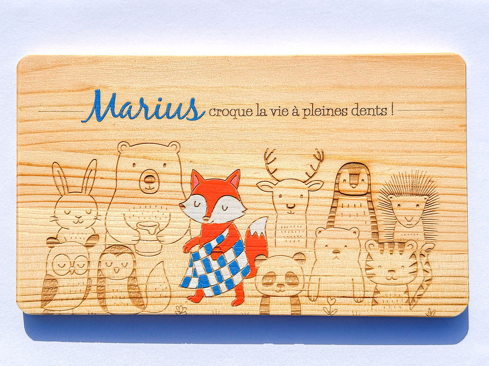 Chaque plaque est gravée au laser et peinte à la main dans notre atelier, sur un bois naturel clair au grain fin.